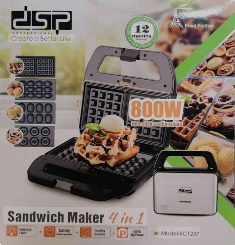 قدرت: 800 وات اندازه صفحه داخلی: 21.6x12 سانتی متر صفحات قابل جدا شدن چهار برش: وافل، آجیل، دونات، صدف مسکن خارج از فنول پانل استیل ضد زنگ نشانگر سوئیچ برق حفاظت از گرمای بیش از حد صفحه آلومینیومی با روکش نچسب دارای قفل ایمنی