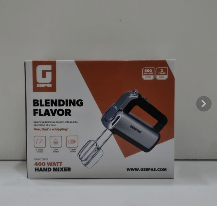 برند Geepas ساخت چین سفارش امارات متحده عربی نوع برقی مدل GHM2001N توان 400 وات اقلام همراه 2 عدد همزن + 2 عدد خمیرزن طول کابل 2 متر جنس بدنه استیل ضد زنگ دفترچه راهنما دارد.