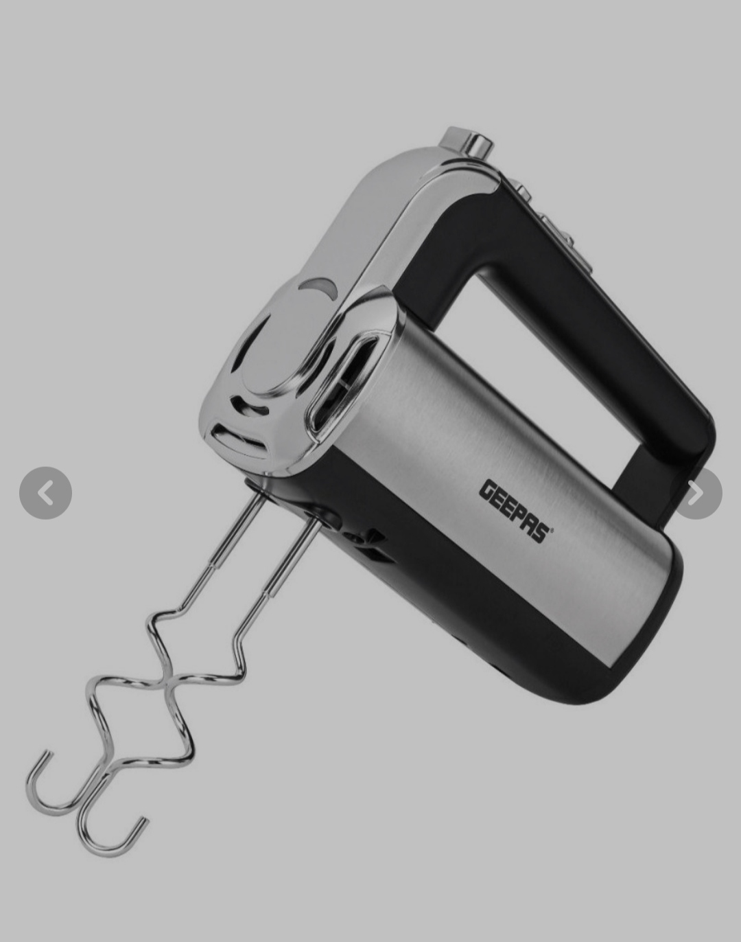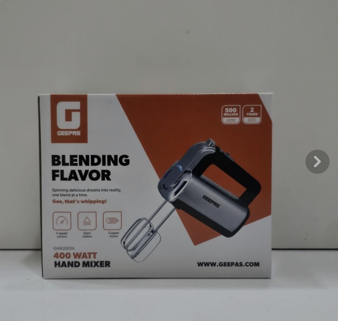 برند Geepas ساخت چین سفارش امارات متحده عربی نوع برقی مدل GHM2001N توان 400 وات اقلام همراه 2 عدد همزن + 2 عدد خمیرزن طول کابل 2 متر جنس بدنه استیل ضد زنگ دفترچه راهنما دارد